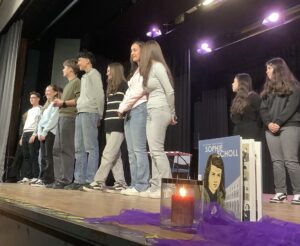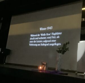 „Bist du ´Scholl` oder denkst du nur an dich selbst?“ In einer solch ausdrucksstarken Formulierung brachten die Schülerinnen und Schüler der Jahrgangsstufe 10 das Ergebnis der Beschäftigung mit der Geschichte der Namensgeber der Städtischen Geschwister- Scholl- Realschule auf den Punkt. „Bist du ´Scholl` oder denkst du nur an dich selbst?“ In diesem Jahr stand insbesondere die Geschichte von Sophie Scholl im Mittelpunkt. Als junge Frau hatte sie Träume, wollte ein Studium beenden, wollte mit ihrem Verlobten das gemeinsame Leben gestalten. Ihr Verlobter Fritz Hartnagel war als Soldat verpflichtet worden, die gemeinsame Zeit war nur sehr kurz. Und neben diesen auch und gerade von jungen Menschen nachvollziehbaren Träumen fühlte Sophie sich gemeinsam mit den anderen Mitgliedern der Widerstandsgruppe Weiße Rose verpflichtet, für die Menschenwürde aller Menschen einzutreten. Die Schüler und Schülerinnen zeigten in Präsentationen sowohl die Geschichte der Weißen Rose als auch den christlichen Hintergrund der Geschwister Hans und Sophie Scholl auf. In einem Anspiel wurde die Bedeutung der Geschwister Scholl für heute deutlich: wir müssen füreinander eintreten, müssen menschenverachtendes Verhalten aufzeigen und beenden, wir müssen unser Verhalten orientieren an denen, deren Namen auf dem Briefkopf unserer Schule stehen: Hans und Sophie Scholl. Und deren Verhalten uns anspornt, selber zumindest ein wenig „Scholl“ zu sein. Hoffentlich bist du „Scholl“ und denkst nicht nur an dich selbst.
